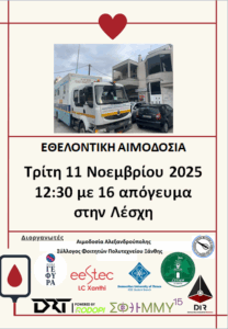 Την Τρίτη 11/11/2025 θα λάβει χώρα εθελοντική αιμοδοσία στο χώρο της λέσχης (στο κέντρο της πόλης), ώρες 12:30-16:00 (πληροφορίες στην αφίσα).